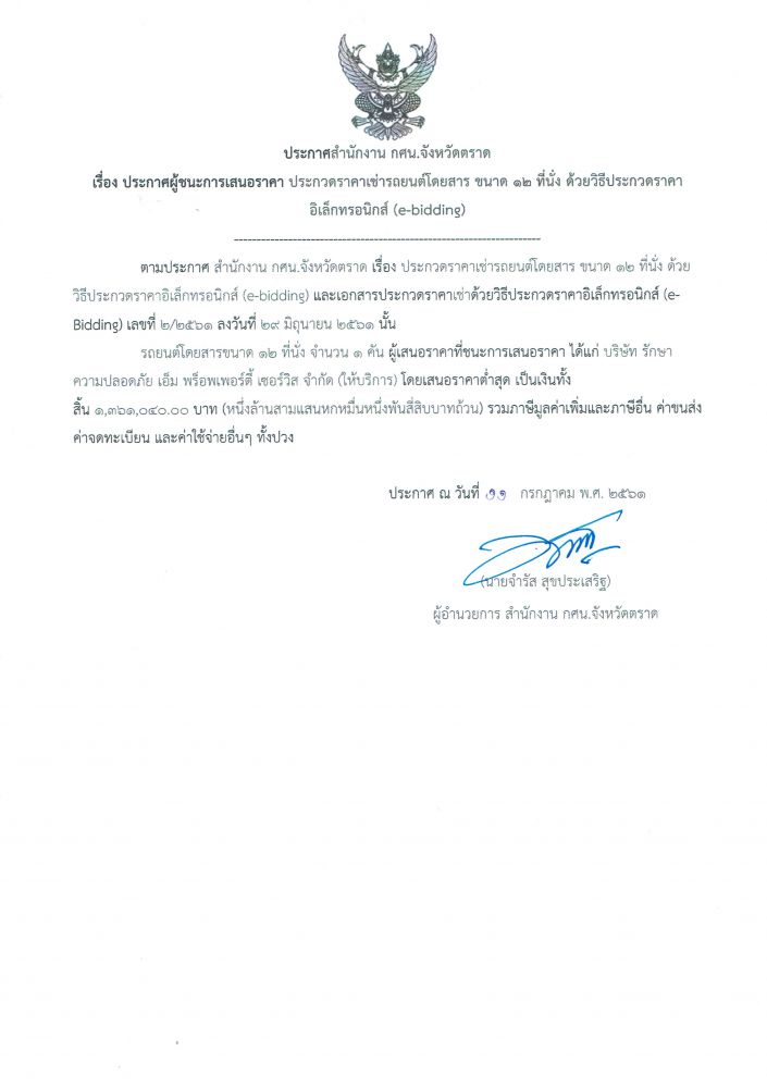 ประกาศผู้ชนะการเสนอราคา ประกวดราคาเช่ารถยนต์โดยสาร ขนาด 12 ที่นั่ง