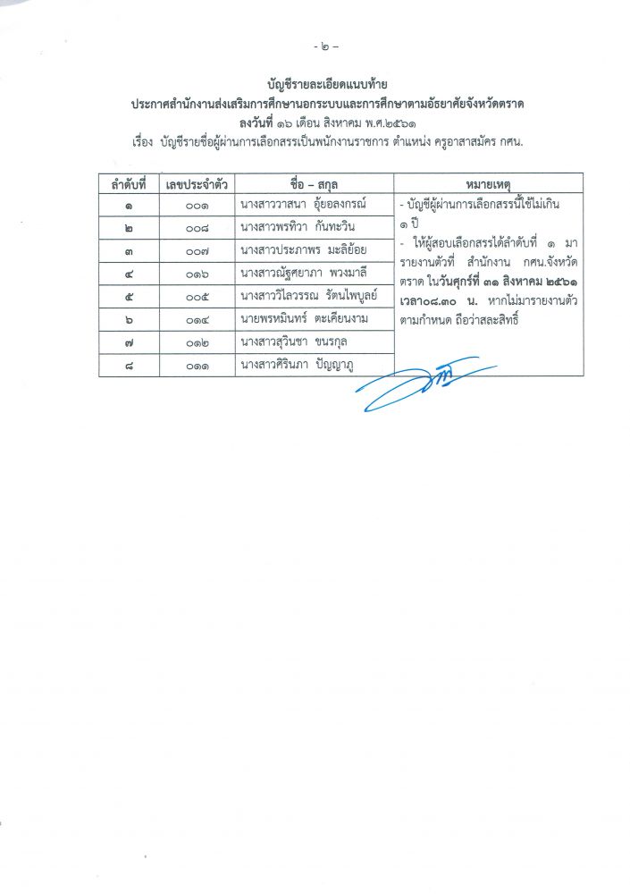 ประกาศ รายชื่อผู้ผ่านการเลือกสรรเป็นพนักงานราชการ ตำแหน่งครูอาสาสมัคร กศน.