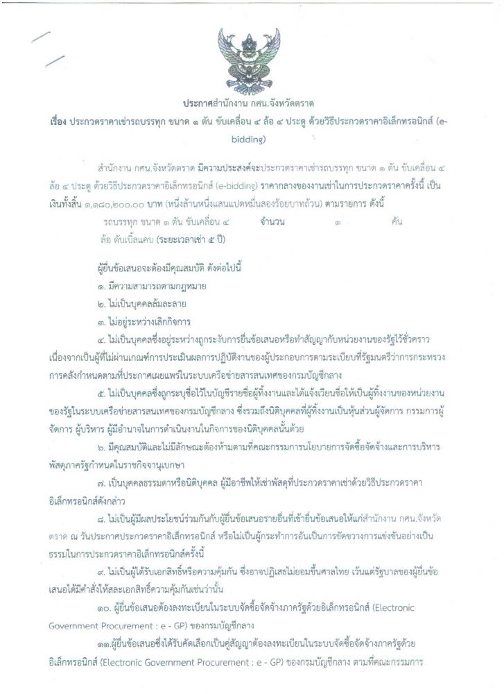 ประกาศ เรื่อง ประกวดราคาเช่ารถบรรทุก ขนาด 1 ตัน ขับเคลื่อน 4 ล้อ 4 ประตุ