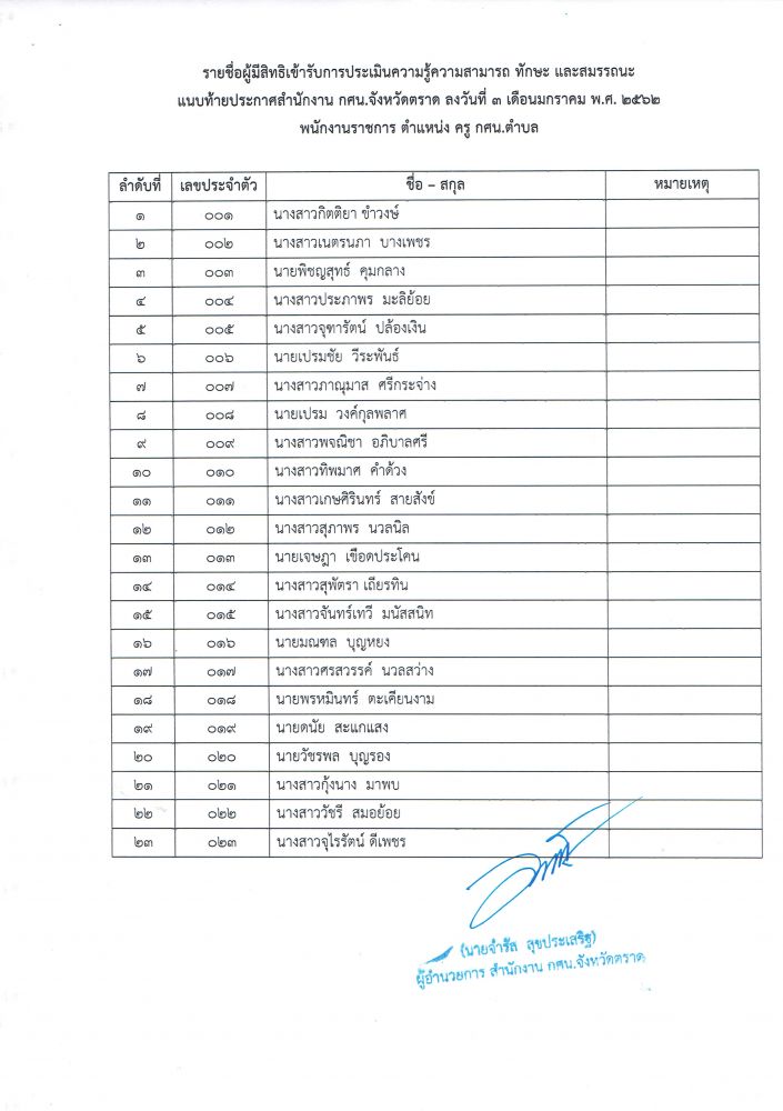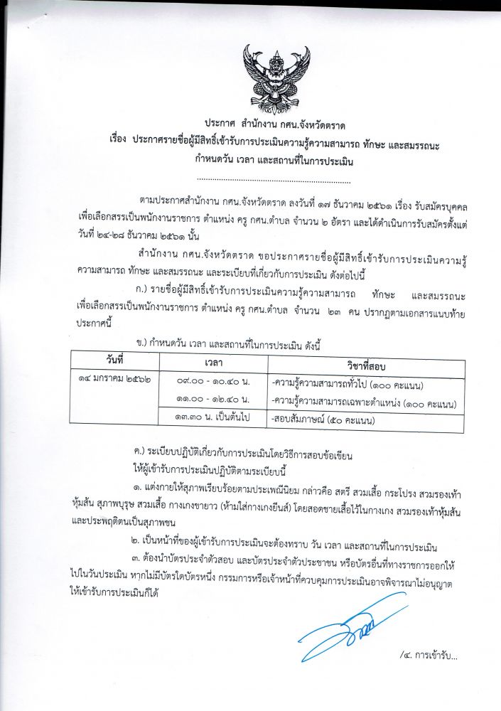 ประกาศรายชื่อผู้มีสิทธิ์เข้ารับการประเมินความรู้ความสามารถ ทักษะ และสมรรถนะ กำหนดวัน เวลา สถานที่ในการประเมิน