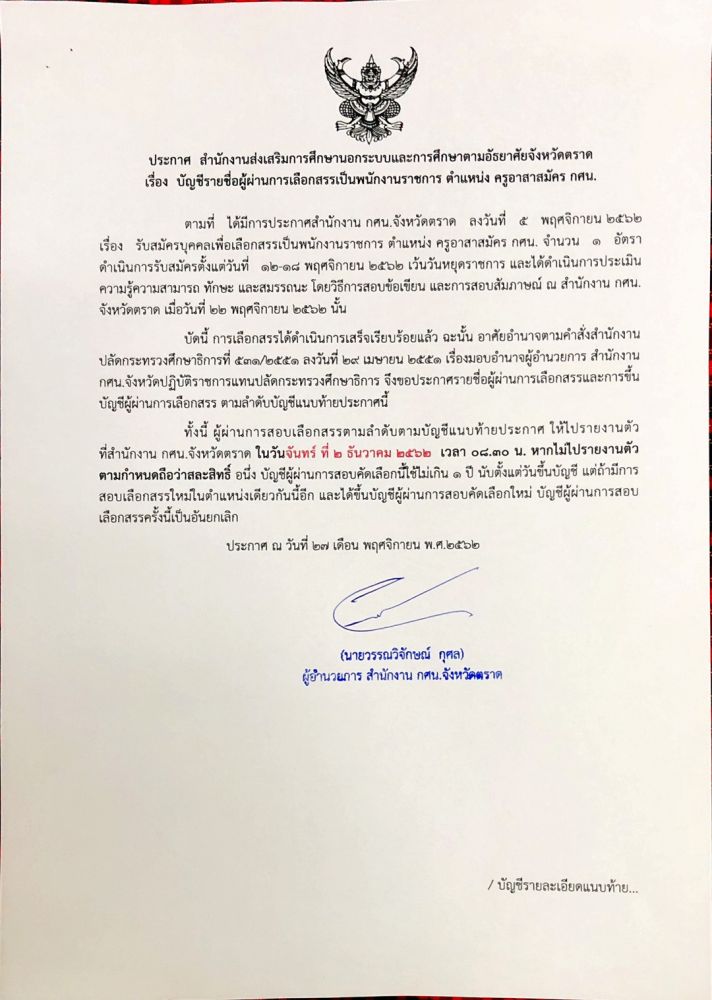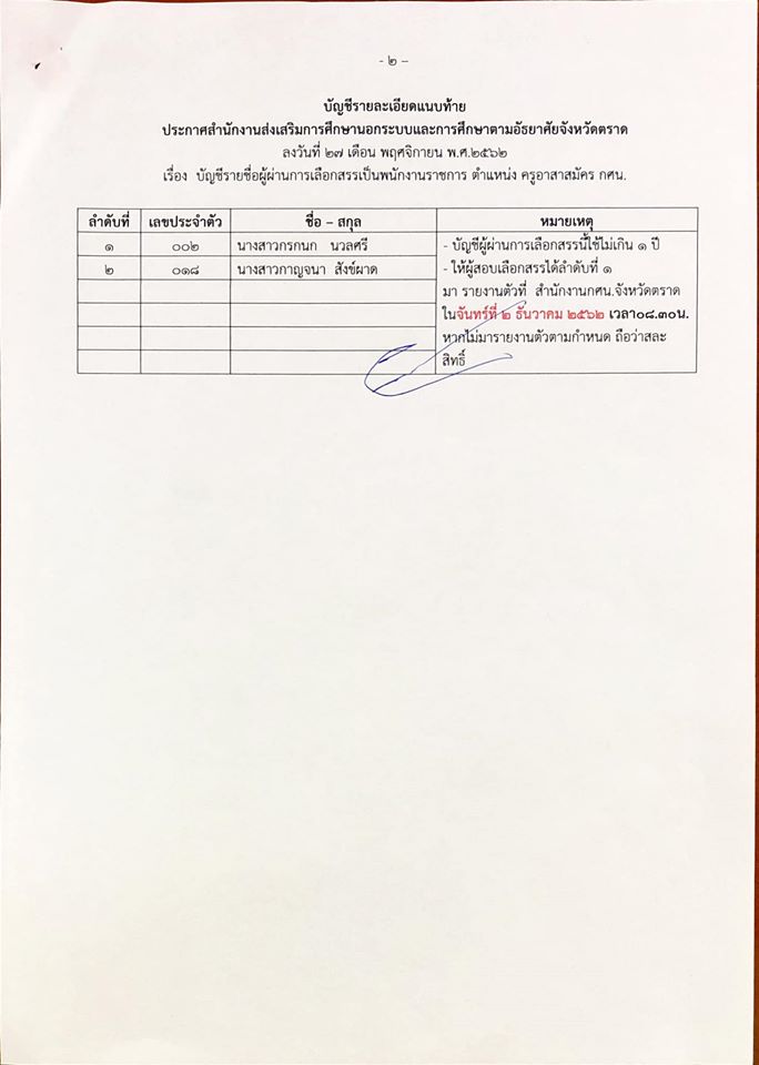 หมวดหมู่ : ข่าวประชาสัมพันธ์ หัวข้อเรื่อง : วันที่ ๒๗ พฤศจิกายน ๒๕๖๒ ######################### ประกาศ บัญชีรายชื่อผู้ผ่านการเลือกสรรเป็นพนักงานราชการ ตำแหน่ง ครูอาสาสมัคร กศน. สำนักงานส่งเสริมการศึกษานอกระบบและการศึกษาตามอัธยาศัยจังหวัดตราด