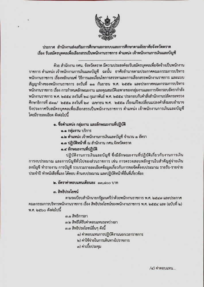 หมวดหมู่ : ข่าวประชาสัมพันธ์ หัวข้อเรื่อง : ประกาศ!! สำนักงานส่งเสริมการศึกษานอกระบบและการศึกษาตามอัธยาศัยจังหวัดตราด เรื่อง รับสมัครบุคคลเพื่อเลือกสรรเป็นพนักงานราชการ ตำแหน่ง เจ้าพนักงานการเงินและบัญชี