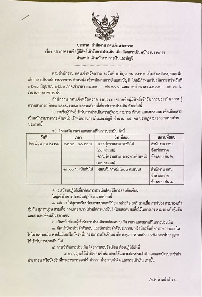 ประกาศ รายชื่อผู้มีสิทธิรับการประเมิน เพื่อเลิอกสรรเป็นพนักงานราชการ ตำแหน้งเจ้าพนักงานการเงิน