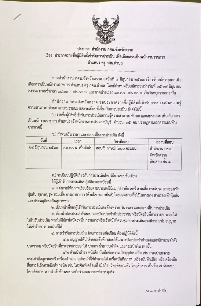 ประกาศ รายชื่อผู้มีสิทธิรับการประเมิน เพื่อเลือกสรรเป็นพนักงานราชการ ตำแหน่ง ครู กศน.ตำบล