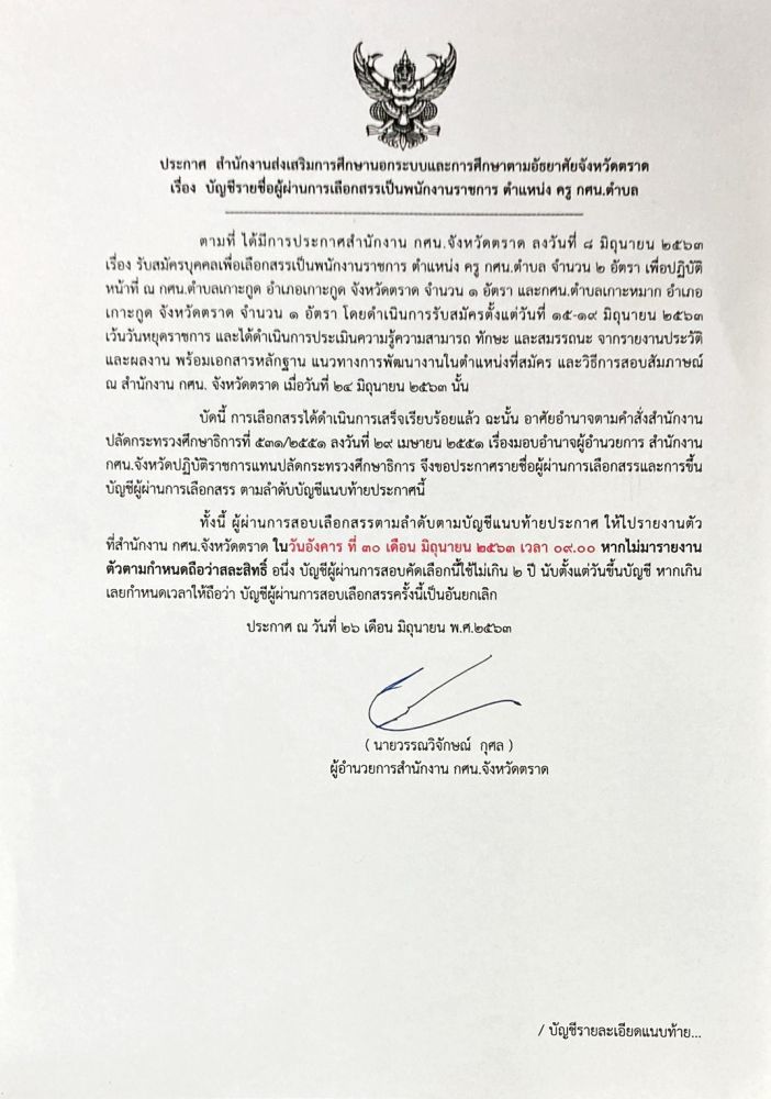 ประกาศรายชื่อผู้ผ่านการเลือกสรรเป็นพนักงานราชการ ตำแหน่ง ครู กศน.ตำบล