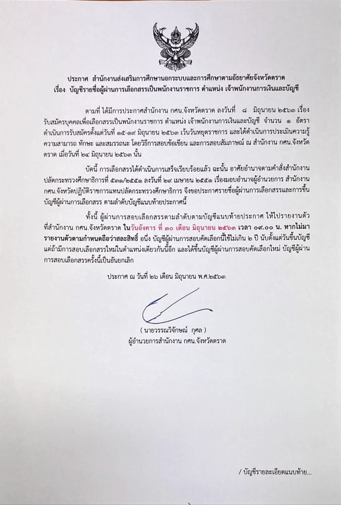 ประกาศ ผู้ผ่านการเลือกสรรเป็นพนักงานราชการ ตำแหน่ง พนักงานการเงืนและบัญชี
