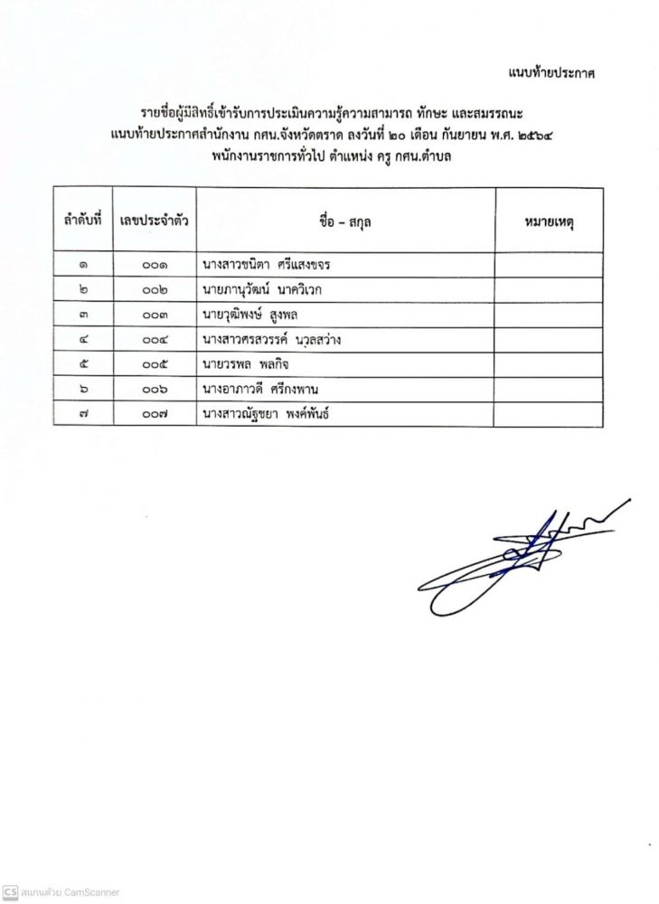 ใบประกาศผู้มีสิทธิ์เลือกสรรเป็นพนักงานราชการ ตำแหน่ง ครู กศน.ตำบล
