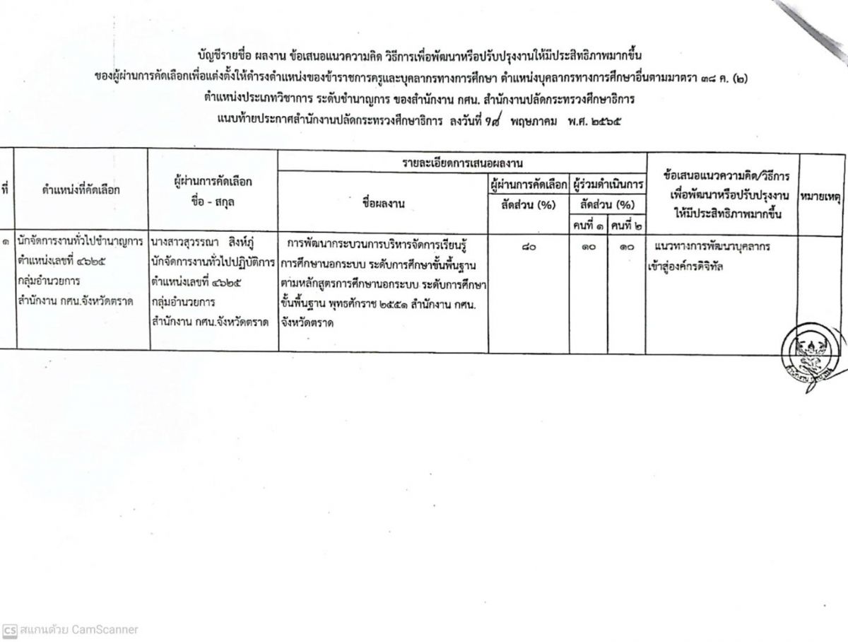 ชื่อผลงานเรื่อง " การพัฒนากระบวนการบริหารจัดการเรียนรู้การศึกษานอกระบบ ระดับการศึกษาขั้นพื้นฐานตามหลักสูตร การศึกษานอกระบบระดับการศึกษาขั้นพื้นฐาน พุทธศักราช 2551 สำนักงาน กศน.จังหวัดตราด และแนวทางการพัฒนาบุคลากรเข้าสู่องค์กรดิจิทัล
