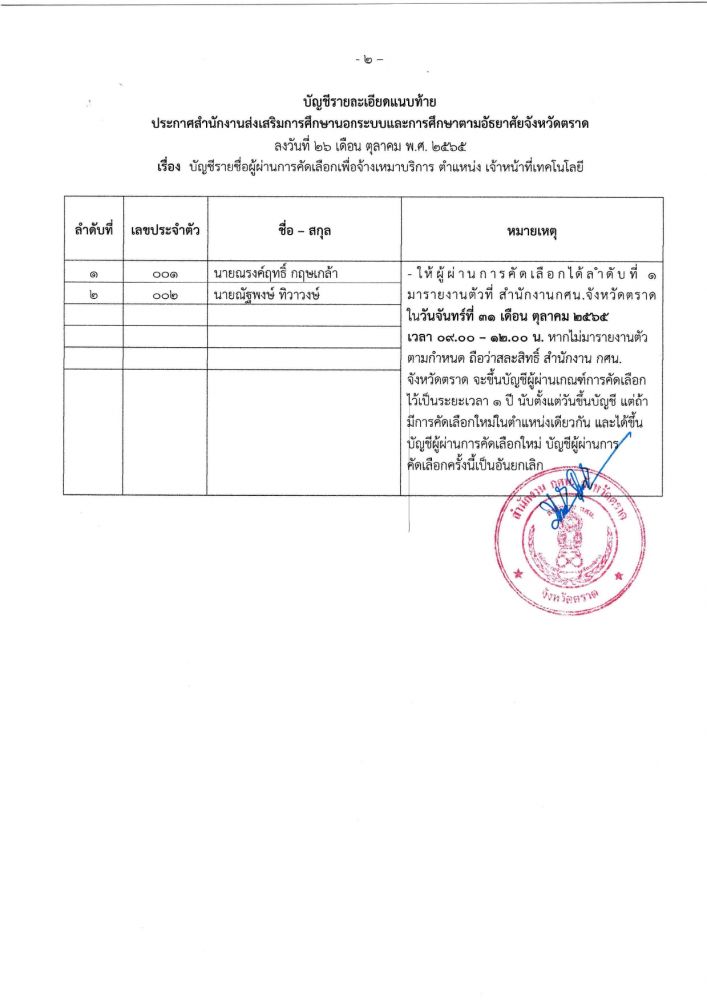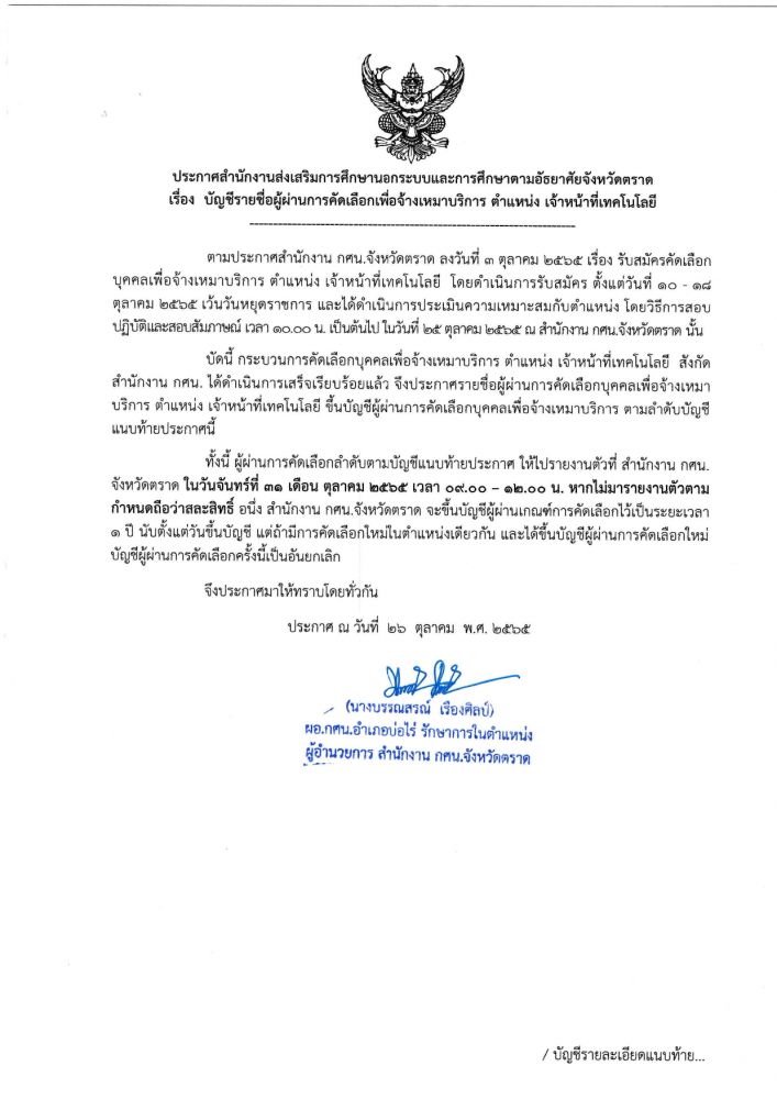 บัญชีรายชื่อผู้ผ่านการคัดเลือกบุคคลเพื่อจ้างเหมาบริการ ตำแหน่ง เจ้าหน้าที่เทคโนโลยี