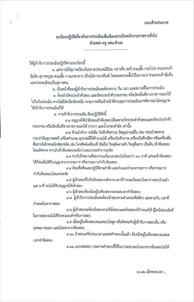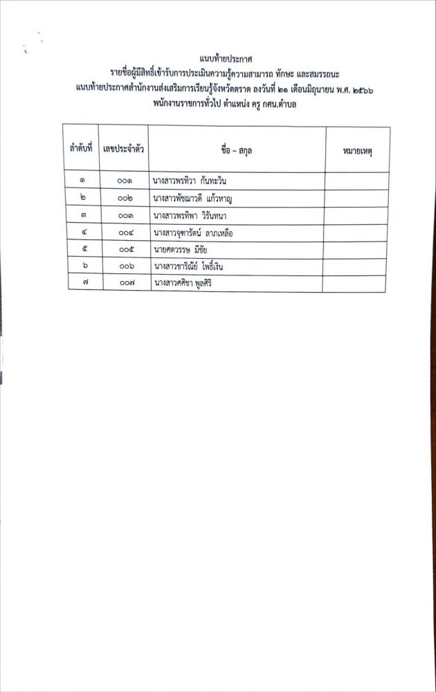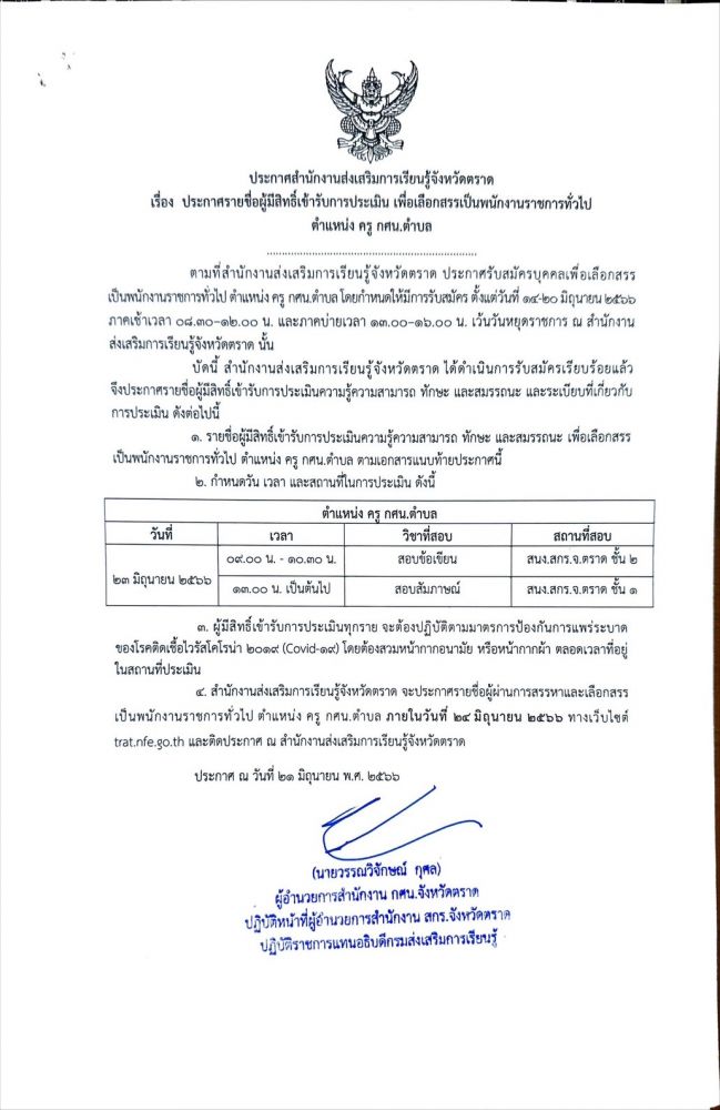 ประกาศรายชื่อผู้มีสิทธิ์เข้ารับการประเมิน เพื่อเลือกสรรเป็นพนักงานราชการทั่วไป ตำแหน่ง ครู กศน.ตำบล