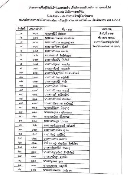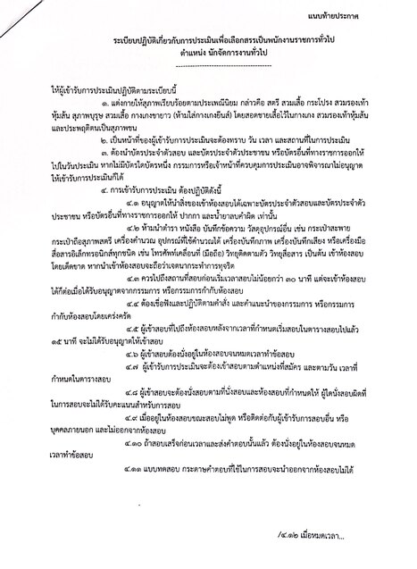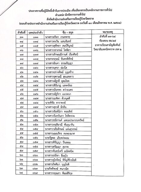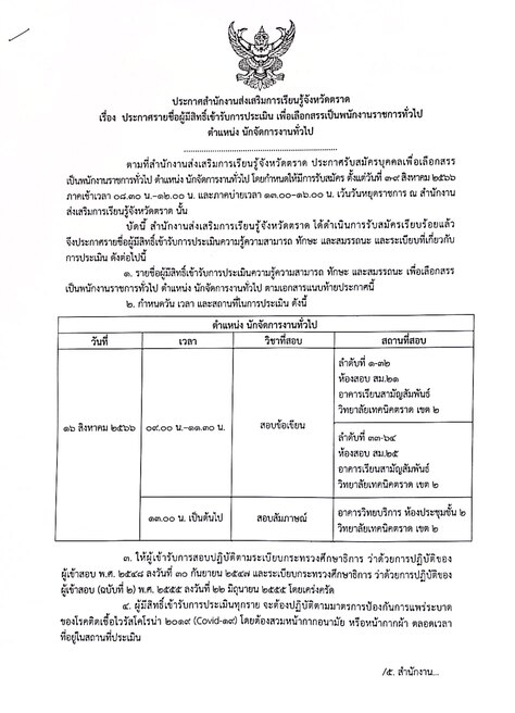 ประกาศรายชื่อผู้มีสิทธิ์เข้ารับการประเมิน เพื่อเลือกสรรเป็นพนักงานราชการทั่วไป ตำแหน่ง นักจัดการงานทั่วไป