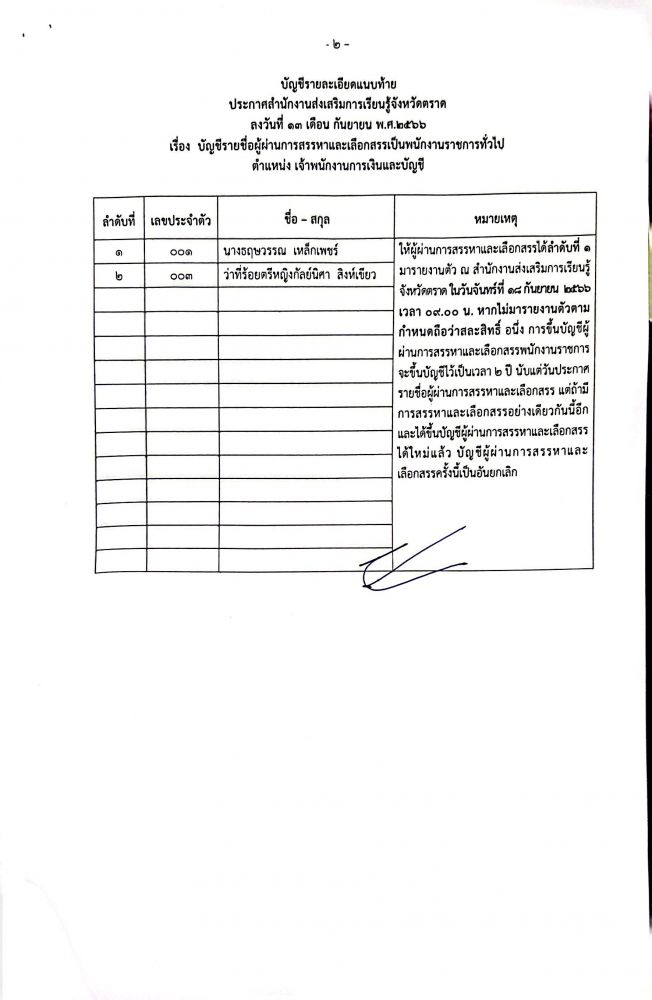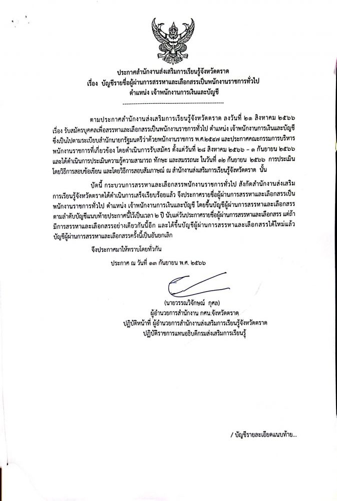 เรื่อง บัญชีรายชื่อผู้ผ่านการสรรหาและเลือกสรรเป็นพนักงานราชการทั่วไป ตำแหน่ง เจ้าพนักงานการเงินและบัญชี