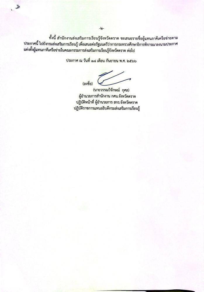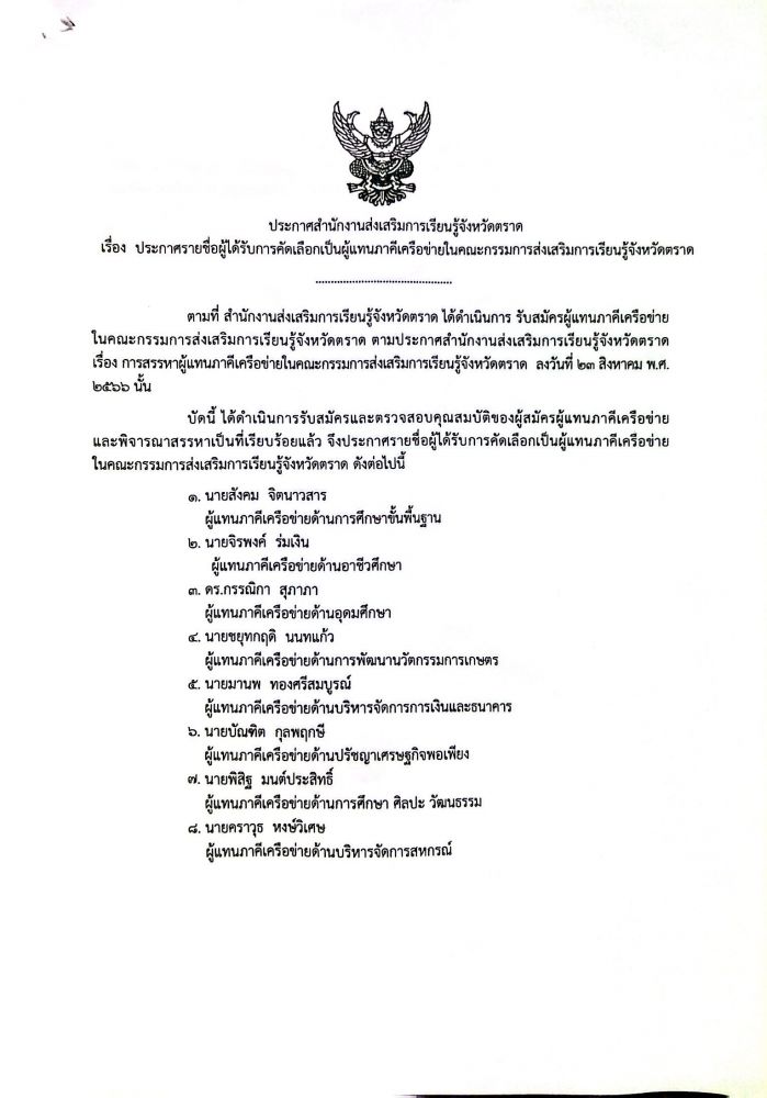 เรื่อง ประกาศรายชื่อผู้ได้รับการคัดเลือกเป็นผู้แทนภาคีเครือข่ายในคณะกรรมการส่งเสริมการเรียนรู้จังหวัดตราด