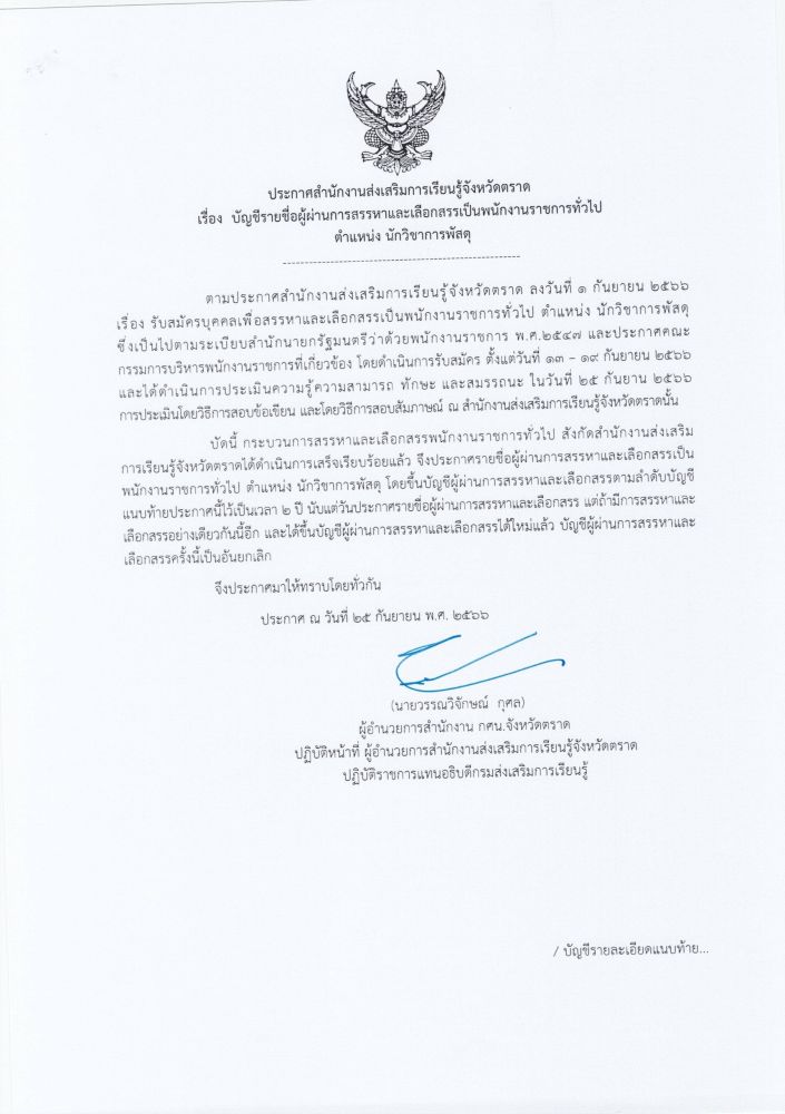 ประกาศสำนักงานส่งเสริมการเรียนรู้ประจำจังหวัดตราด เรื่อง แผนการส่งเสริมการเรียนรู้ของจังหวัดตราด (พ.ศ. ๒๕๖๘ - ๒๕๗๐)