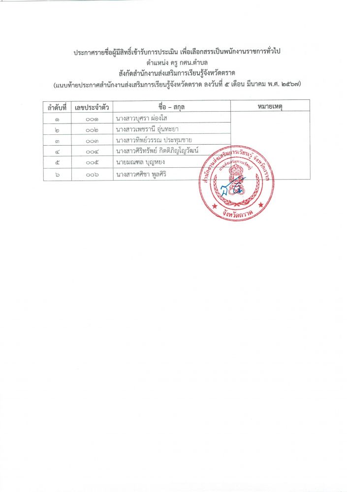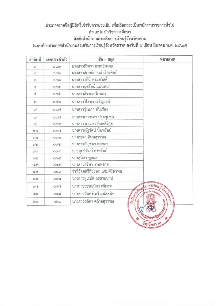 ประกาศรายชื่อผู้มีสิทธิ์เข้ารับการประเมิน เพื่อเลือกสรรเป็นพนักงานราชการทั่วไป